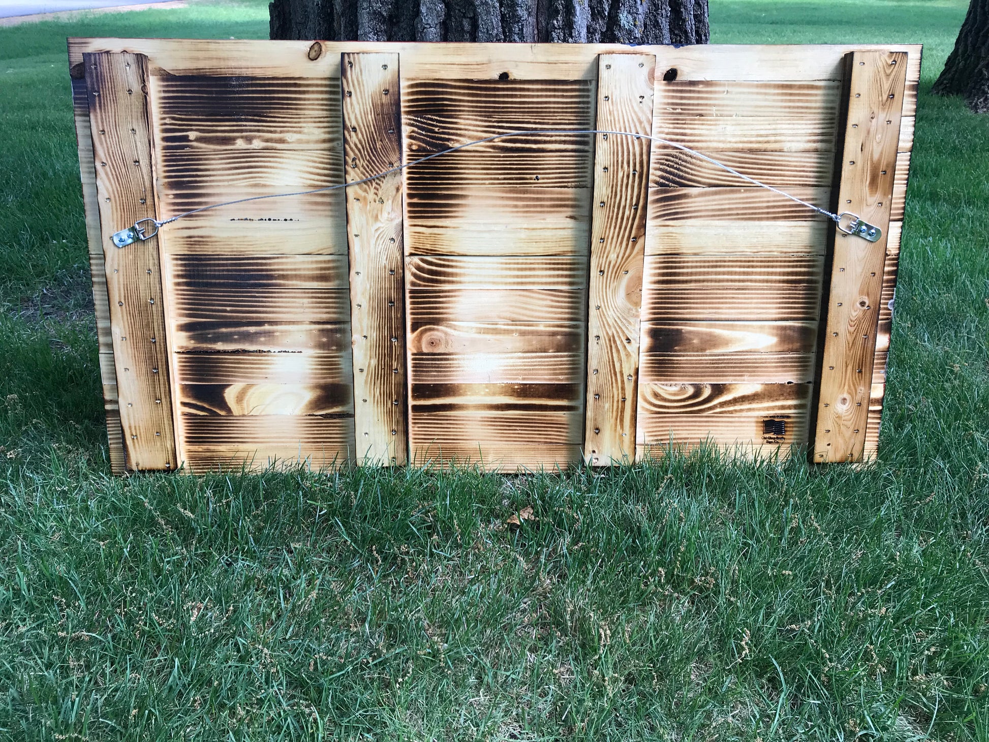 The backside has been charred and finished with four coats of indoor/outdoor Spar Urethane and ready to hang with 2 D-ring hangers and 60 pound wire for stable mounting.