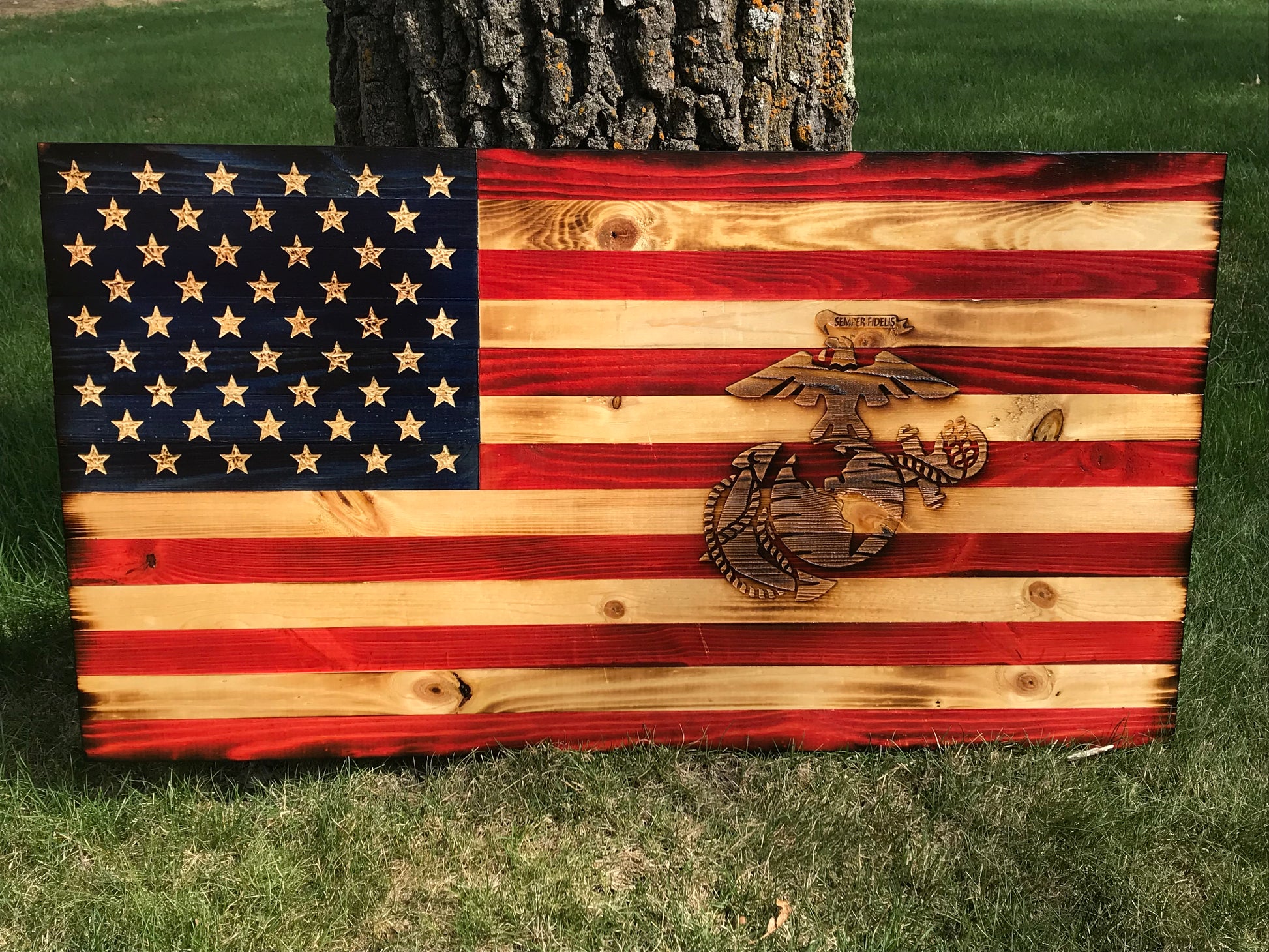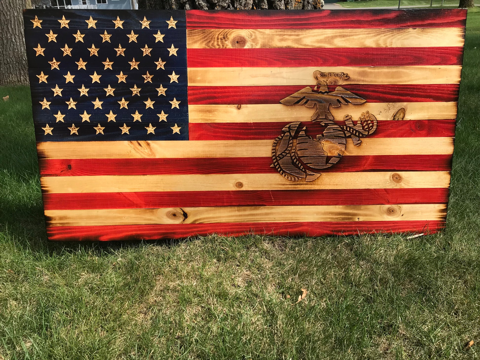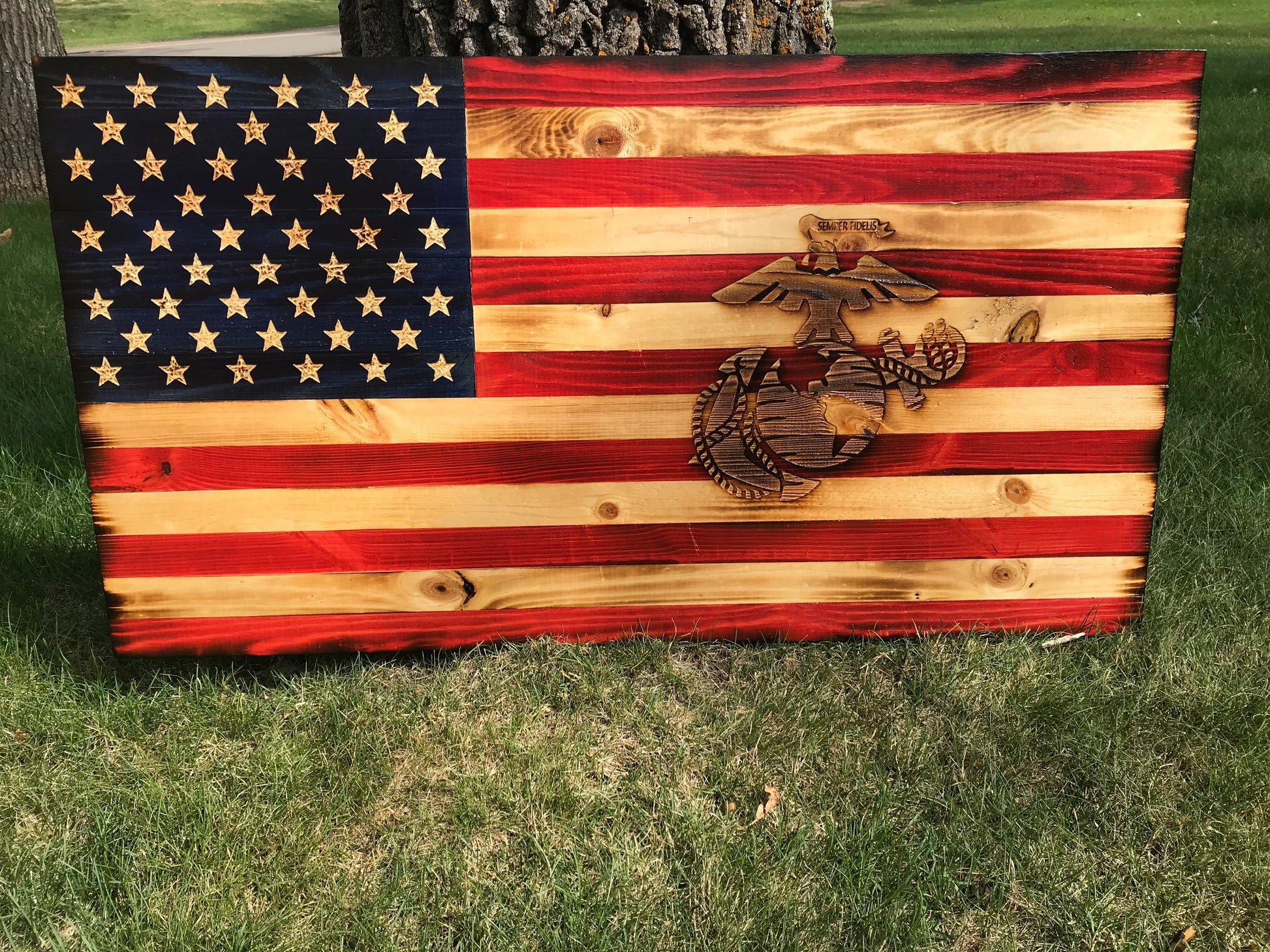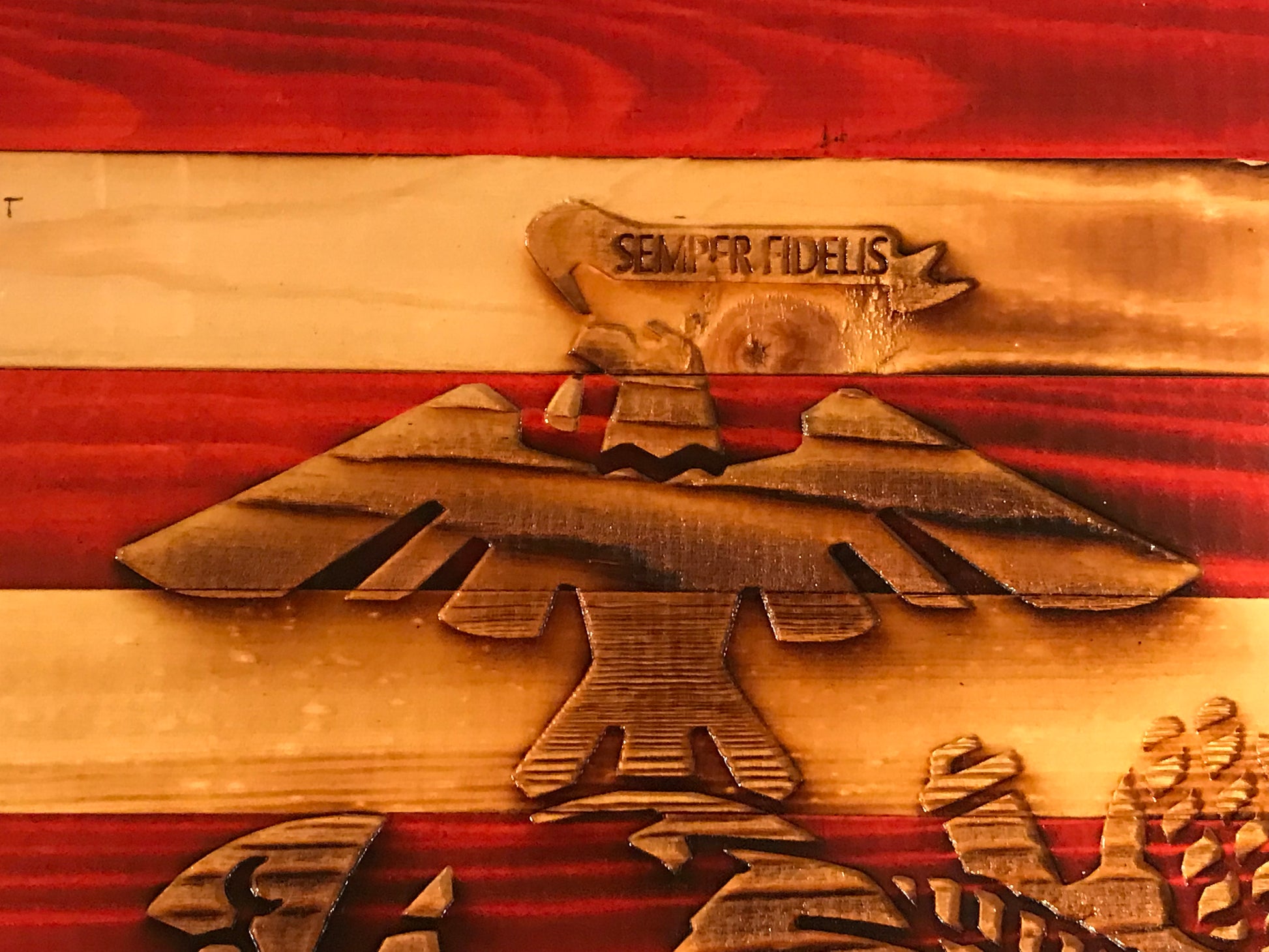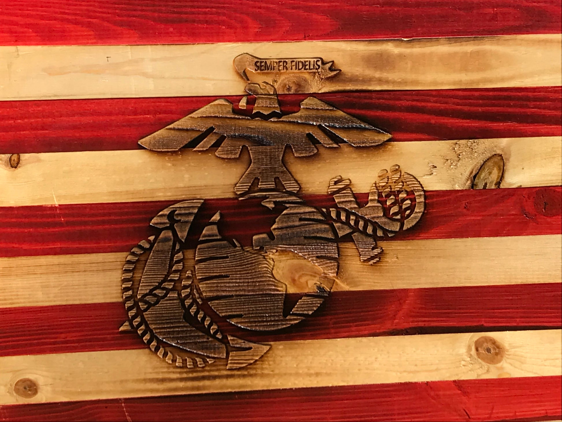 This wooden American Marine Corps flag has been stained in the traditional red, and blue with natural pine stripes. Each star has been meticulously engraved. The Marine Corps emblem has been laser engraved and is standing boldly in the center of the stripes. It has been charred to lend a distressed appearance. The flag pictured is finished with four coats of indoor/outdoor gloss Spar Urethane.