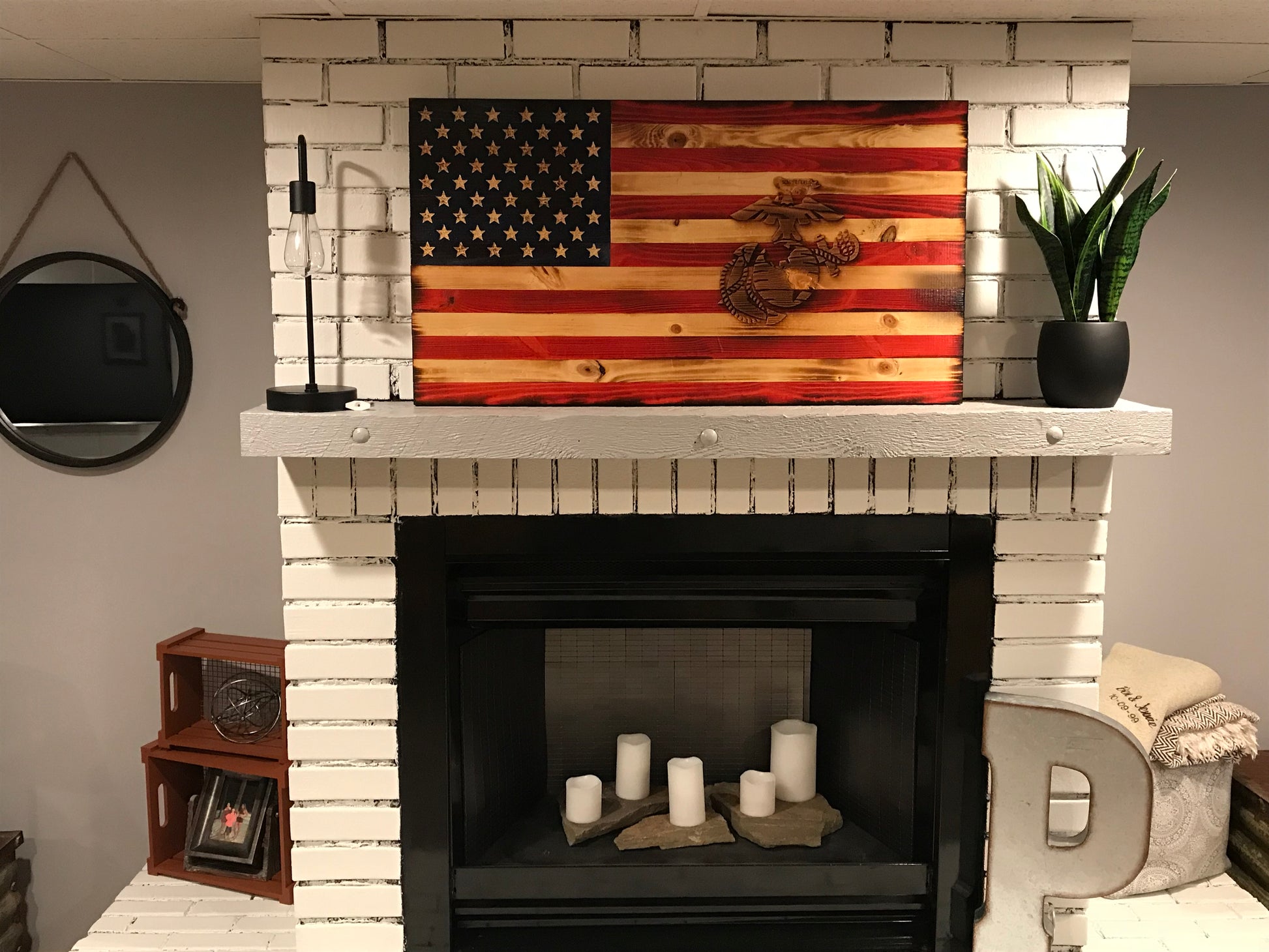 Honor the men and women who have proudly served the United States Marine Corps with this rustic American Marine Corps Flag. Built from 13 individual pieces of wood glued together and braced on the back with four 1" x 3" boards glued and stapled for added stability.