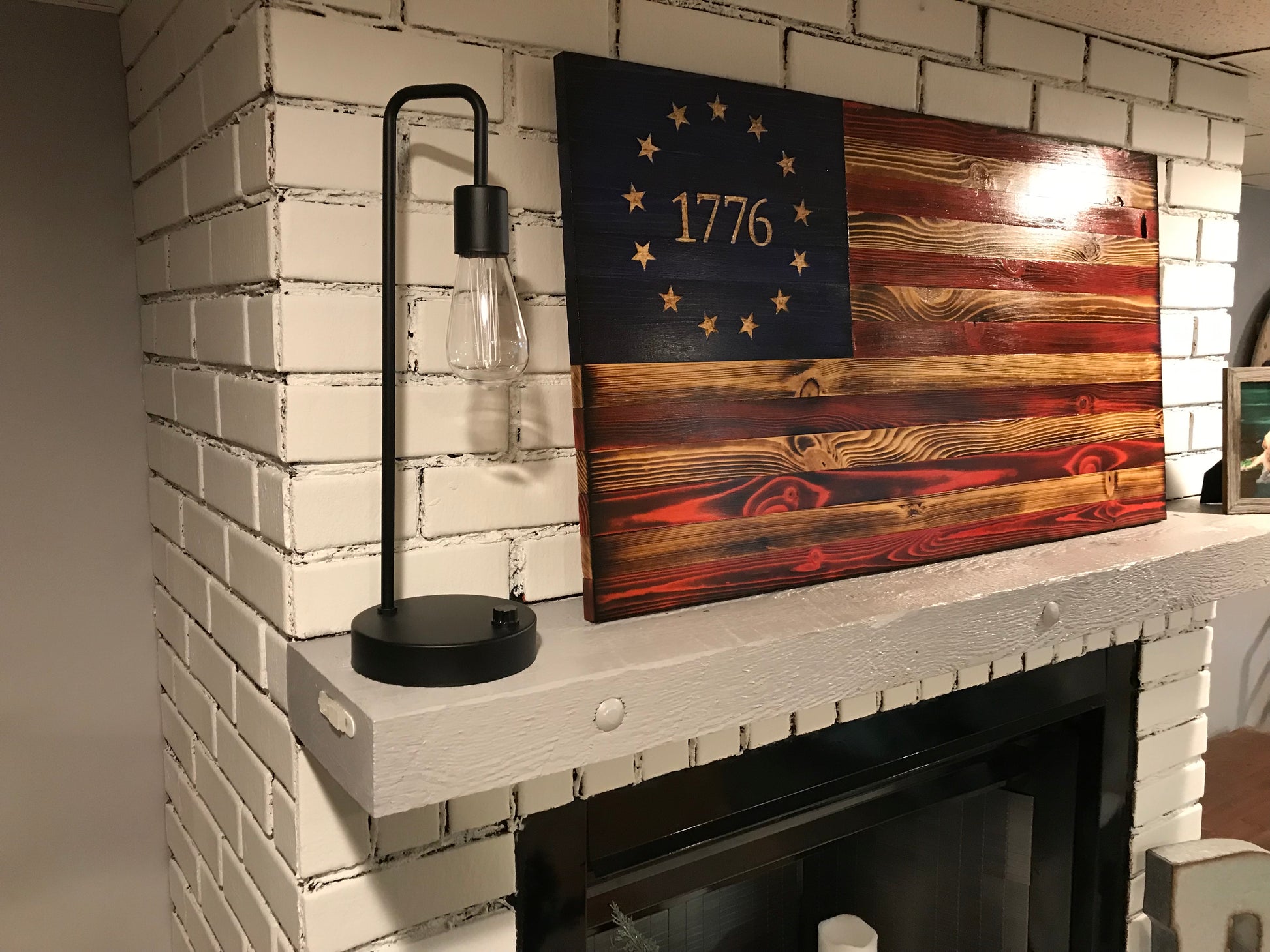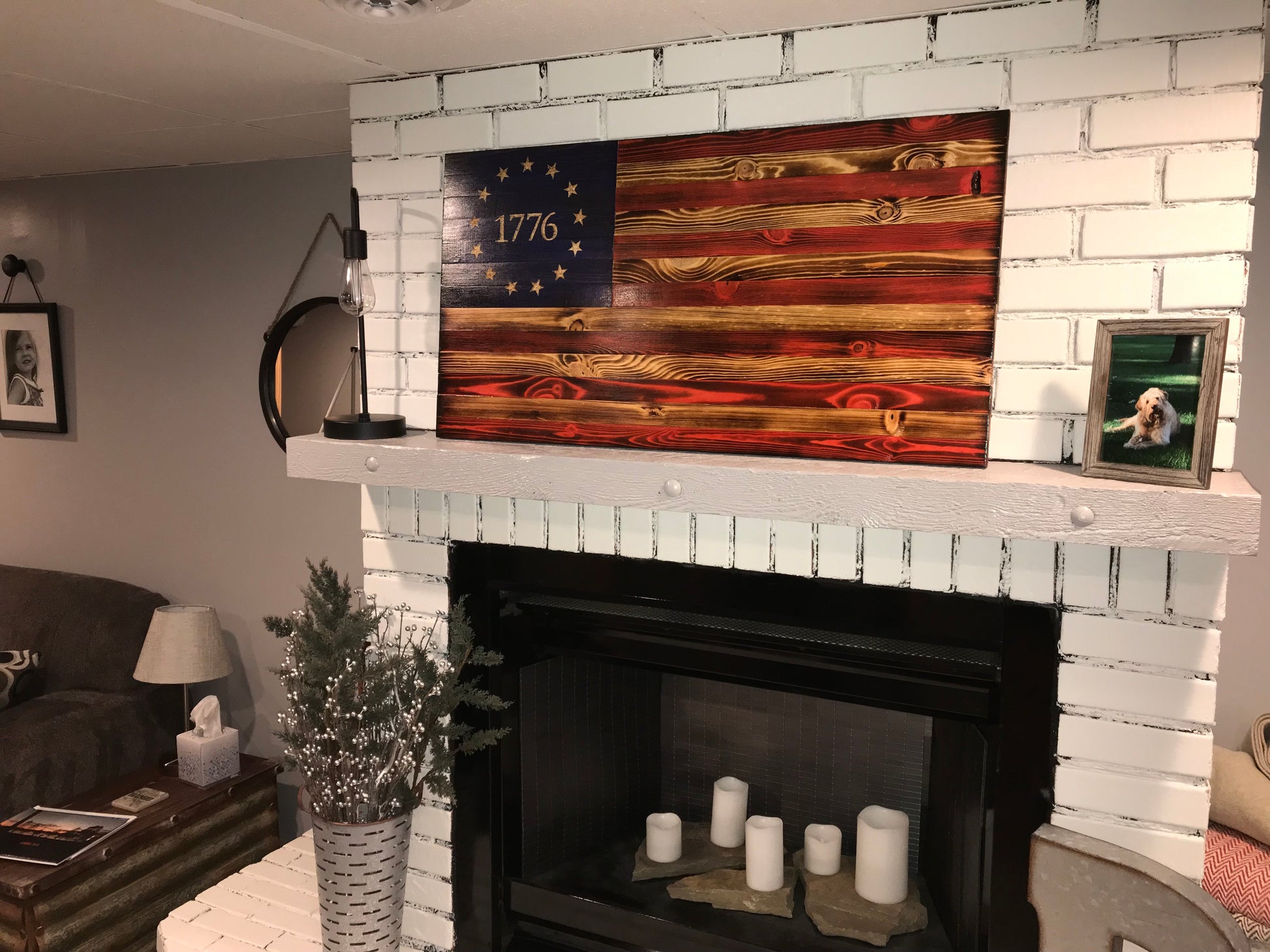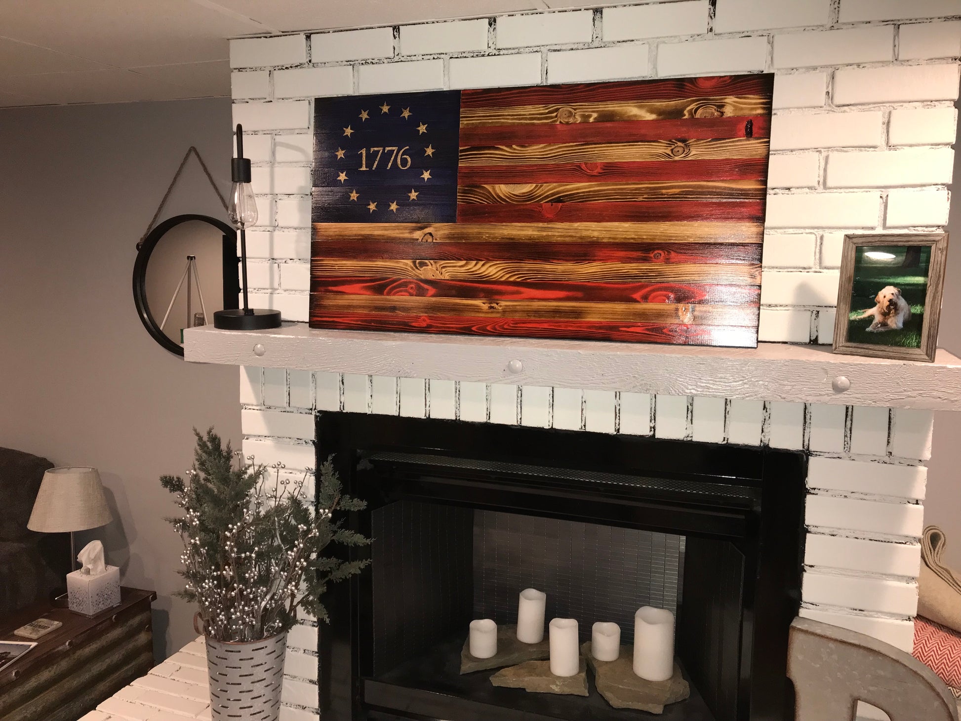 Each piece of wood is hand selected and meticulously prepared to ensure a truly wonderful and striking piece. The stripes are stained Red, White stripes on this flag are natural pine and the union is blue. The thirteen stripes are glued together with interior/exterior glue. To ensure longevity, the back of the flag has 1" x 3" wood strips glued and stapled to the back of the flag.  The flag is then charred to a perfect lightly subdued look . Each flag is finished with four coats of indoor/outdoor clear gloss spar urethane (or indoor matte) along with 60 pound picture wire.