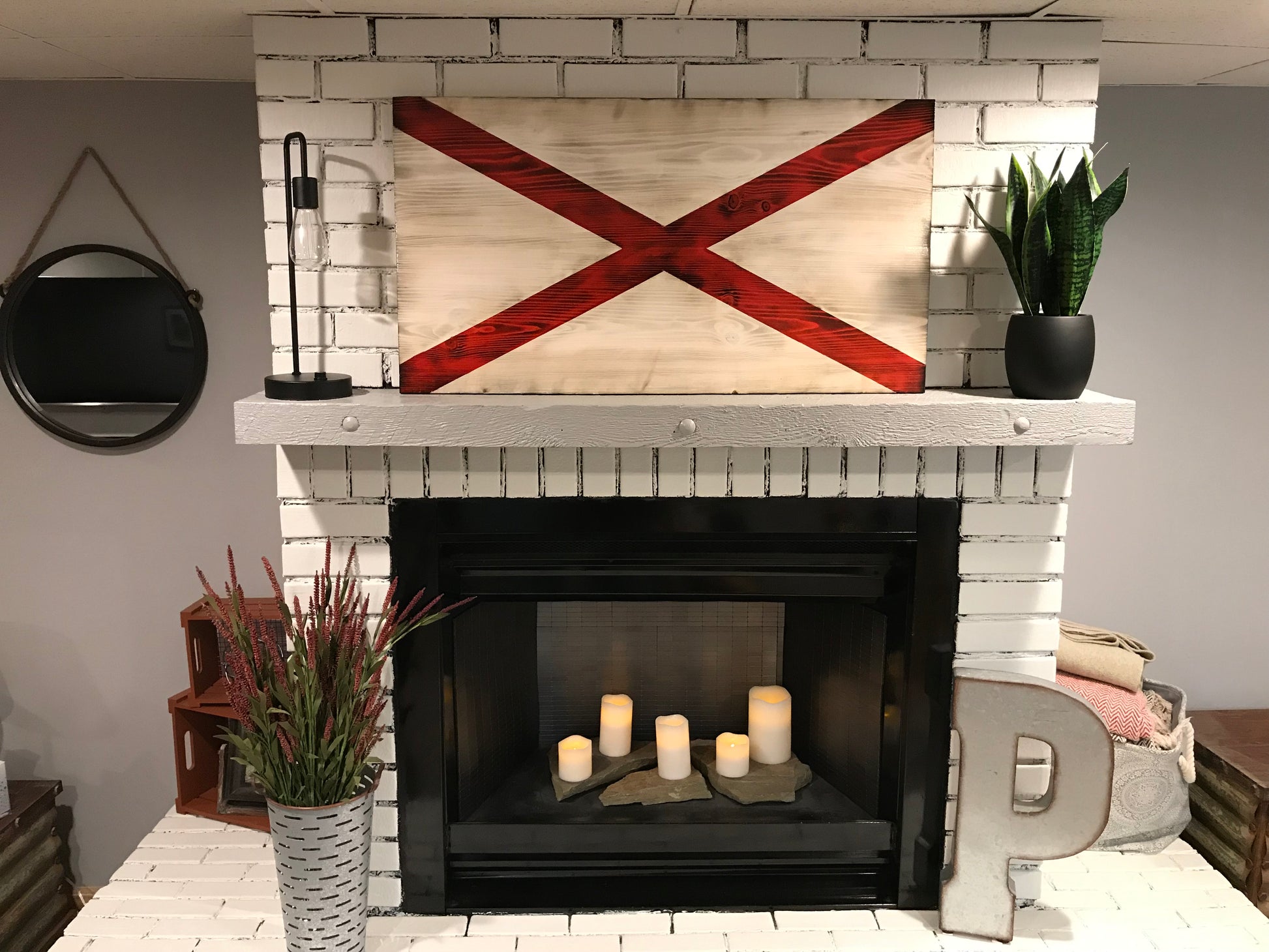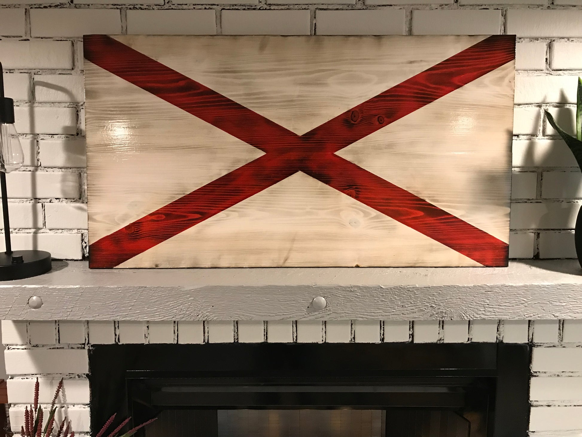 Each piece of wood is hand selected and meticulously prepared to ensure a truly wonderful and striking piece.To ensure longevity, the back of the flag has 1" x 3" wood strips glued and stapled to the back of the flag. The flag is charred to perfection, we also char the back of the flag. Each flag is finished with four coats (front and back) of indoor/outdoor clear gloss spar urethane or indoor matte. The Alabama flag comes ready to hang with 60 pound picture wire attached.