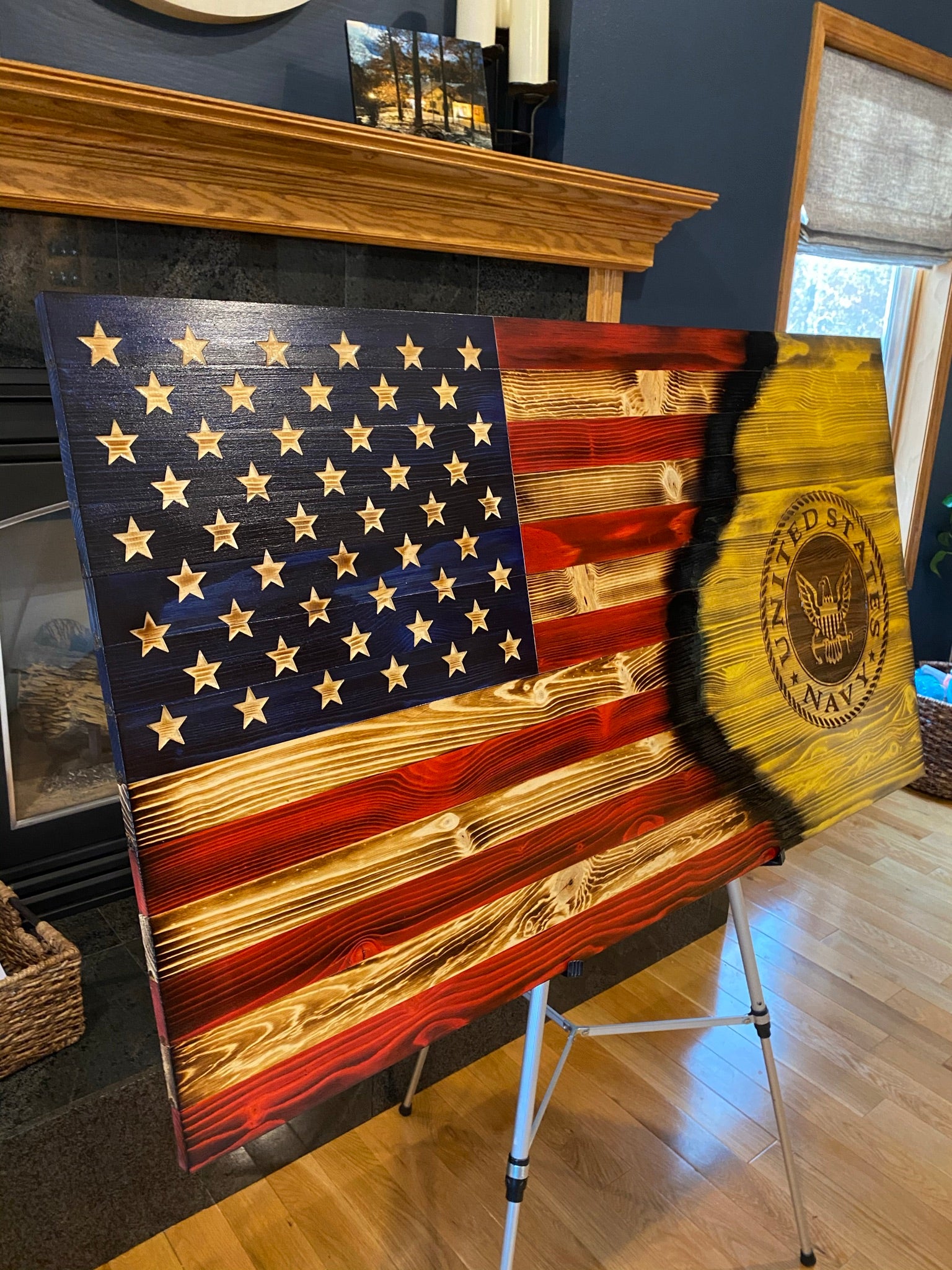 The Navy emblem has been lasered and is standing boldly in the center of the stripes. It has been charred to lend a distressed appearance. The flag pictured is finished with four coats of indoor/outdoor gloss Spar Urethane.