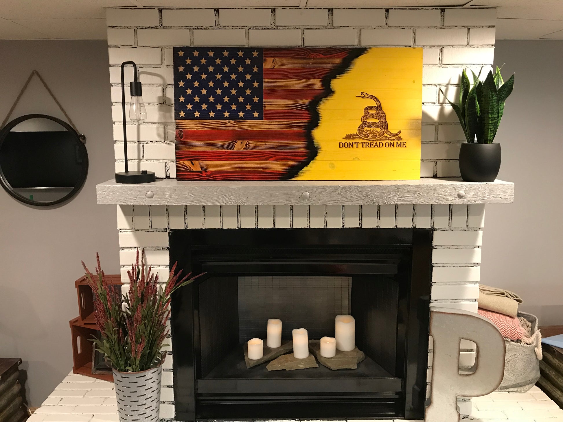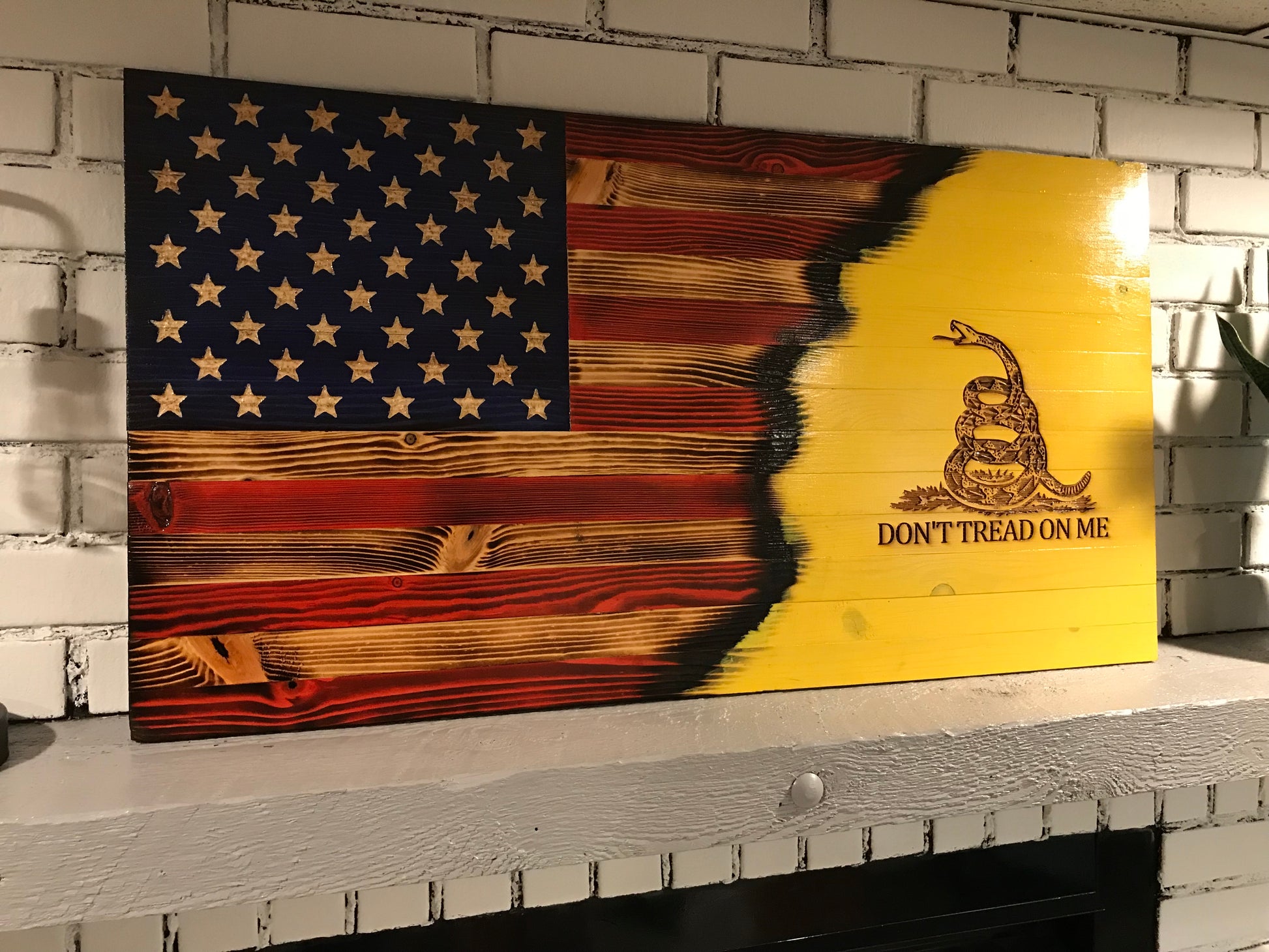 Look no further If you're looking to display some American spirit in your home with this rustic "Don't Tread On Me" American flag wall art!
